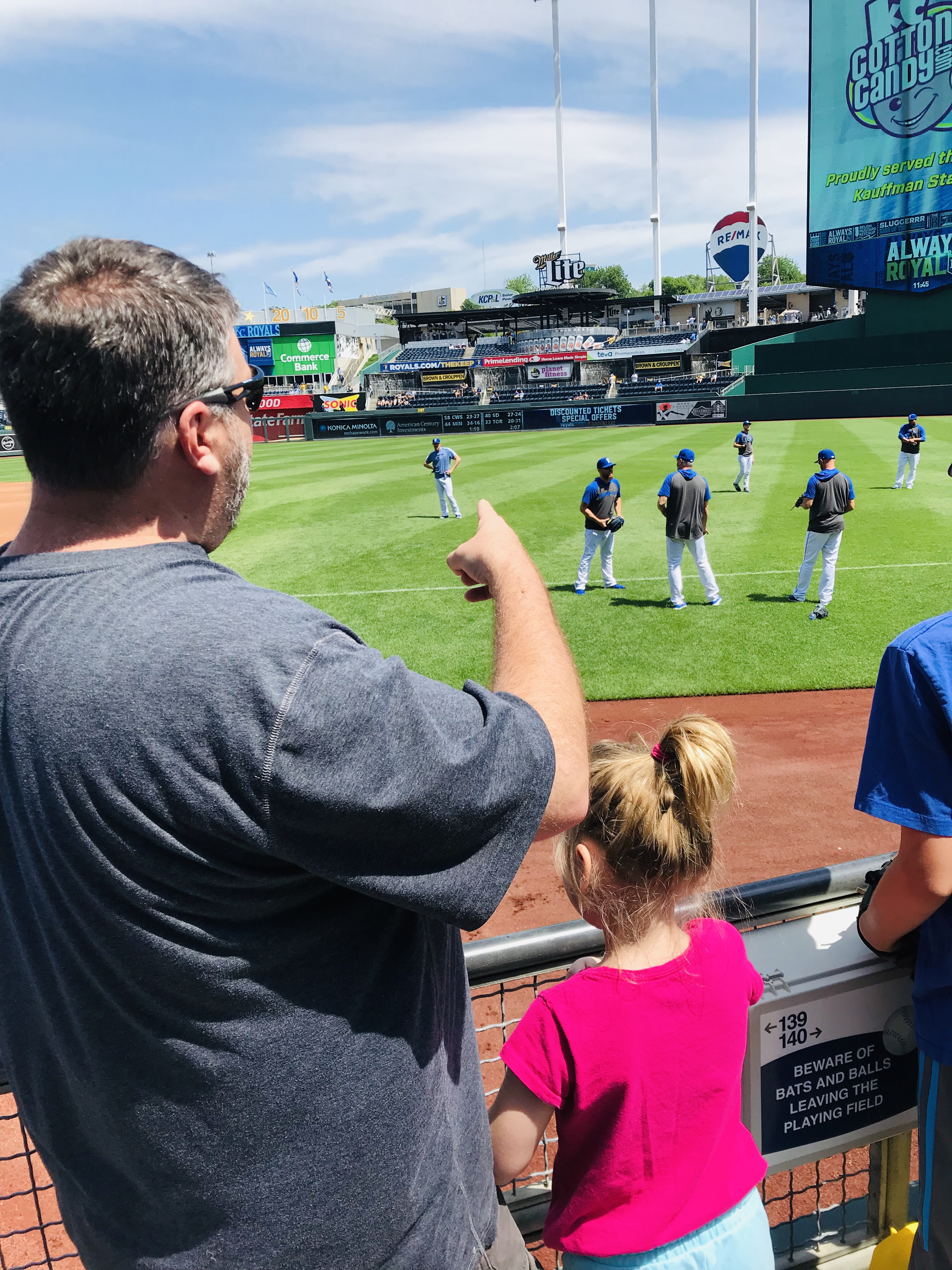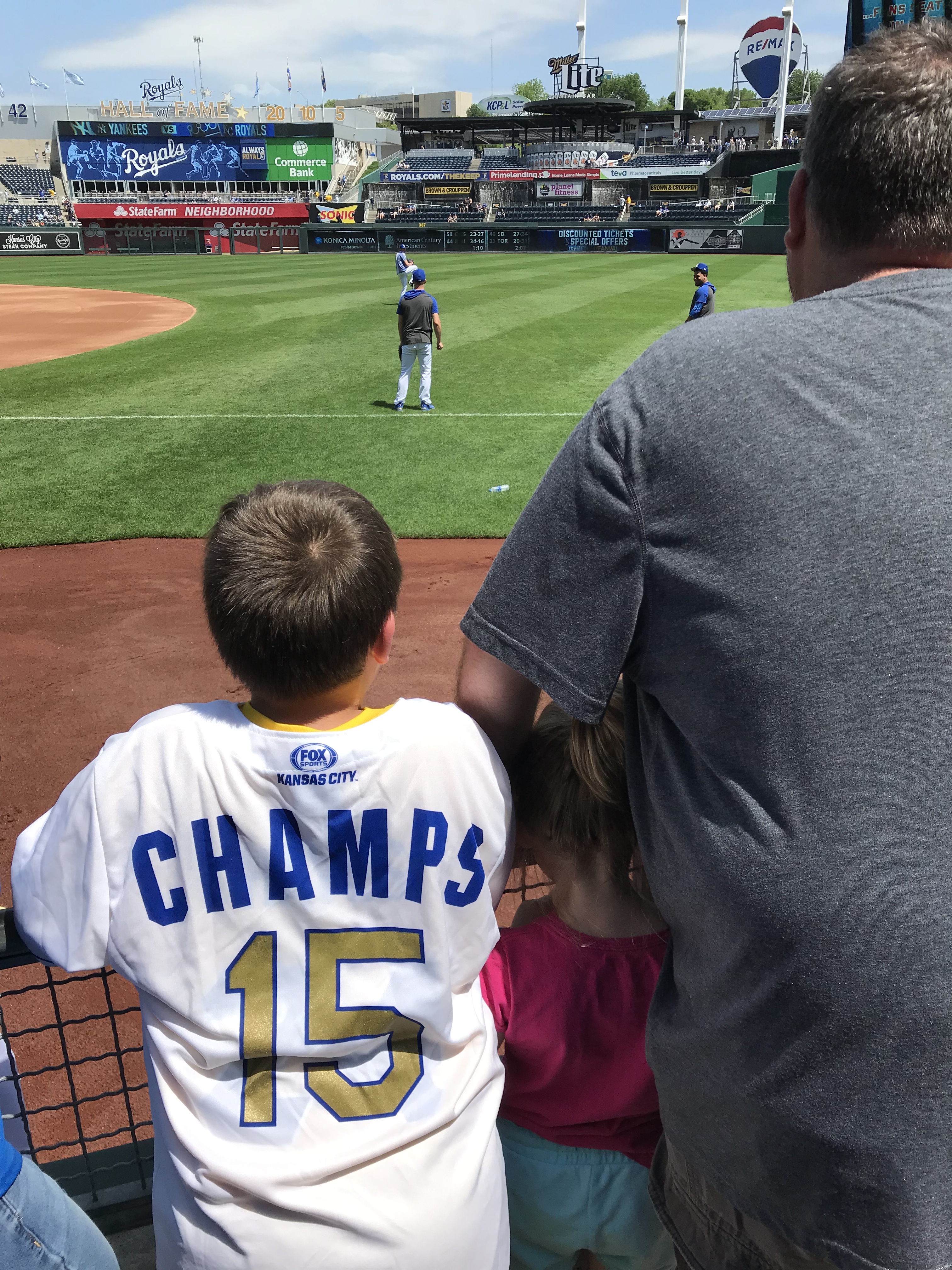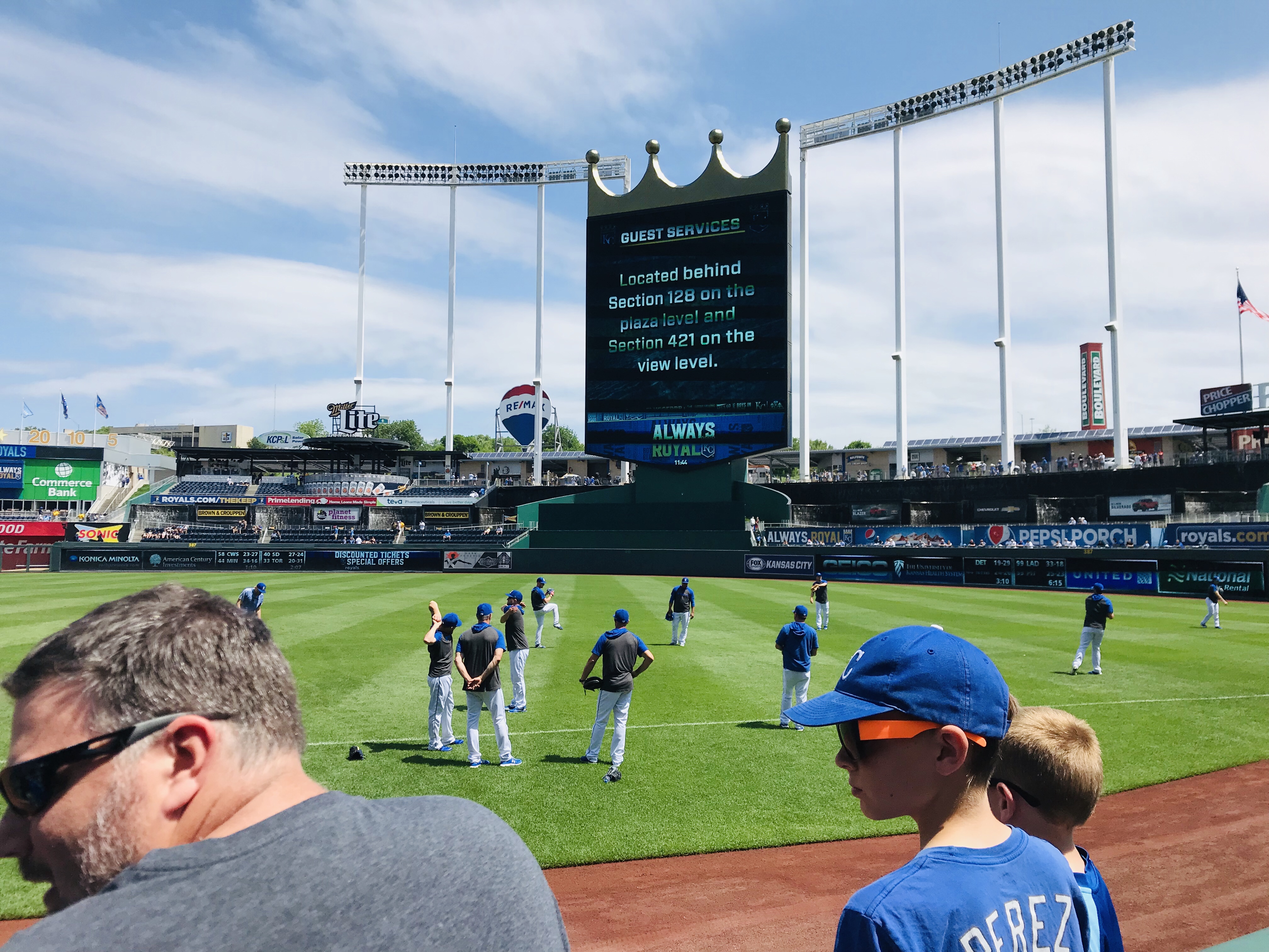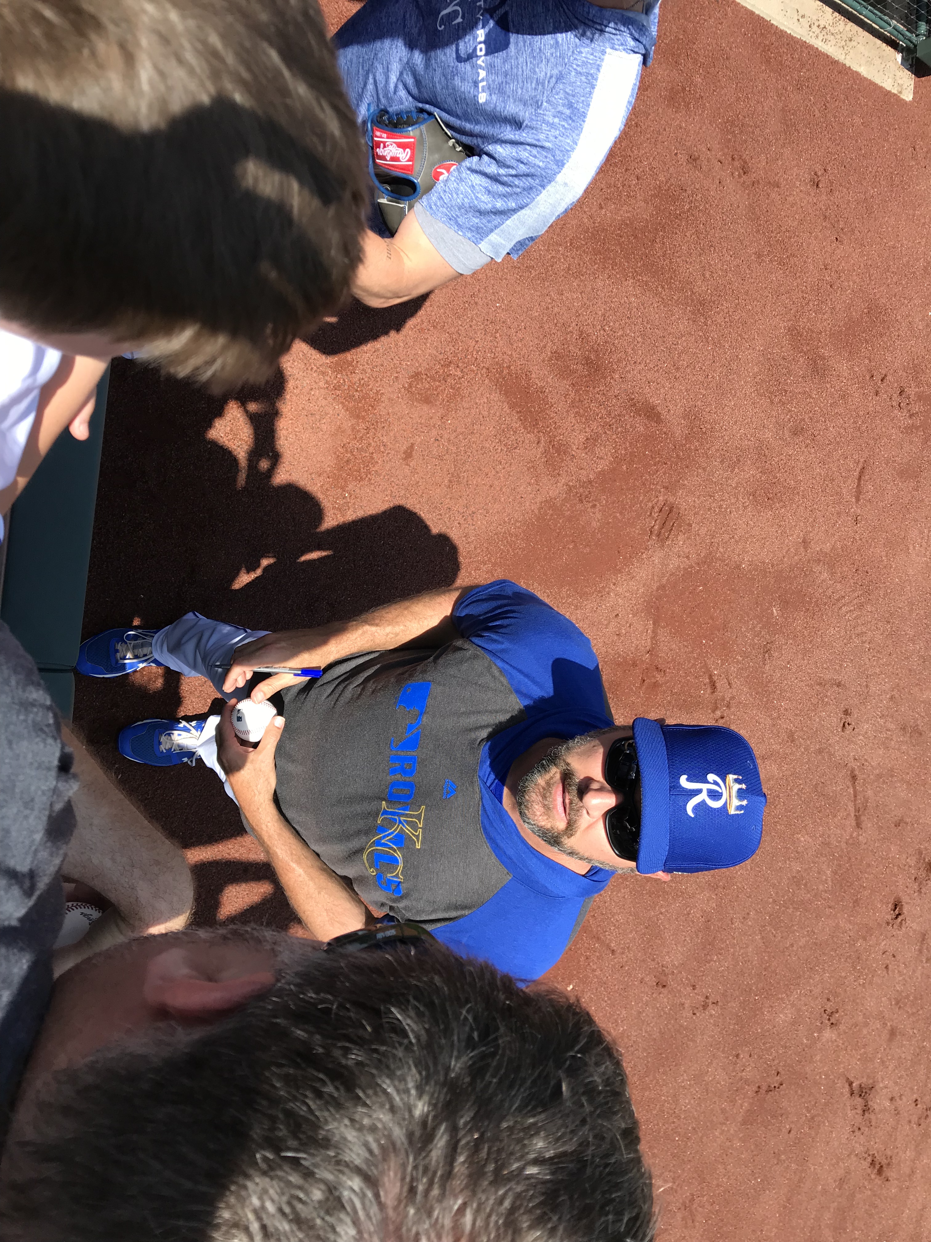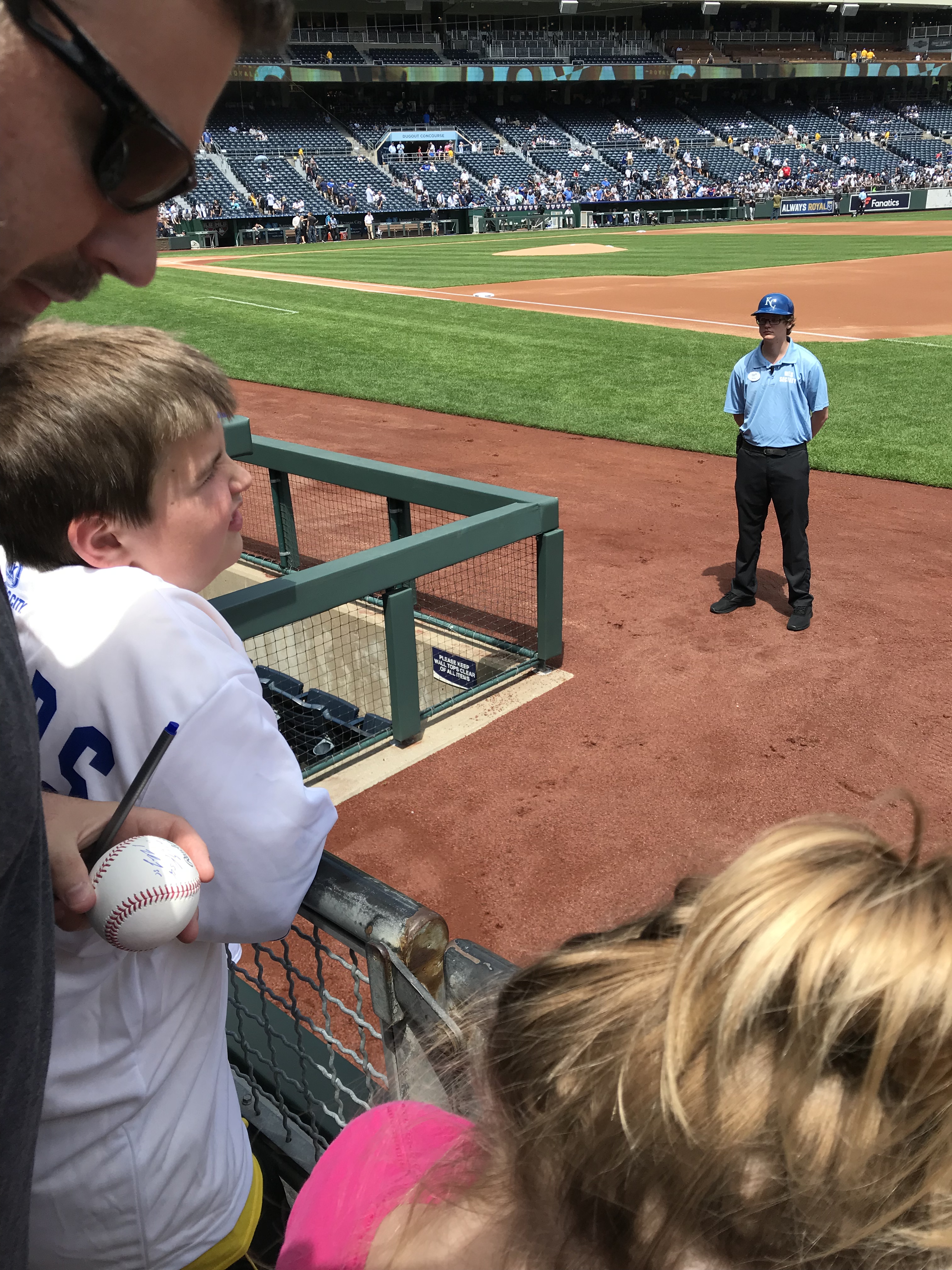 Player Accessibility: Given that the Yankees were the opponents, and the Royals are in a rebuild, we decided that the Royals would present the best opportunity for autographs on this day. We all headed to the outfield side of the first base dugout at gate open and found a prime piece of real estate. At the time of our visit, the nets went to the end of the dugout. Nolan and Sam obtained about 6 autographs each, which is spectacular for a Major League Team (sadly). We also noticed that there was a small area between the dugout and the field seats where a player would occasionally stop and sign, but it wasn’t wide enough to fit more than a few people. We were glad to stick to the spot we had. On the other side of the field, there were several Yankees signing throughout the warm ups, but mobs formed quickly. We were very excited with our results and happy to see a team that was generally happy to sign.