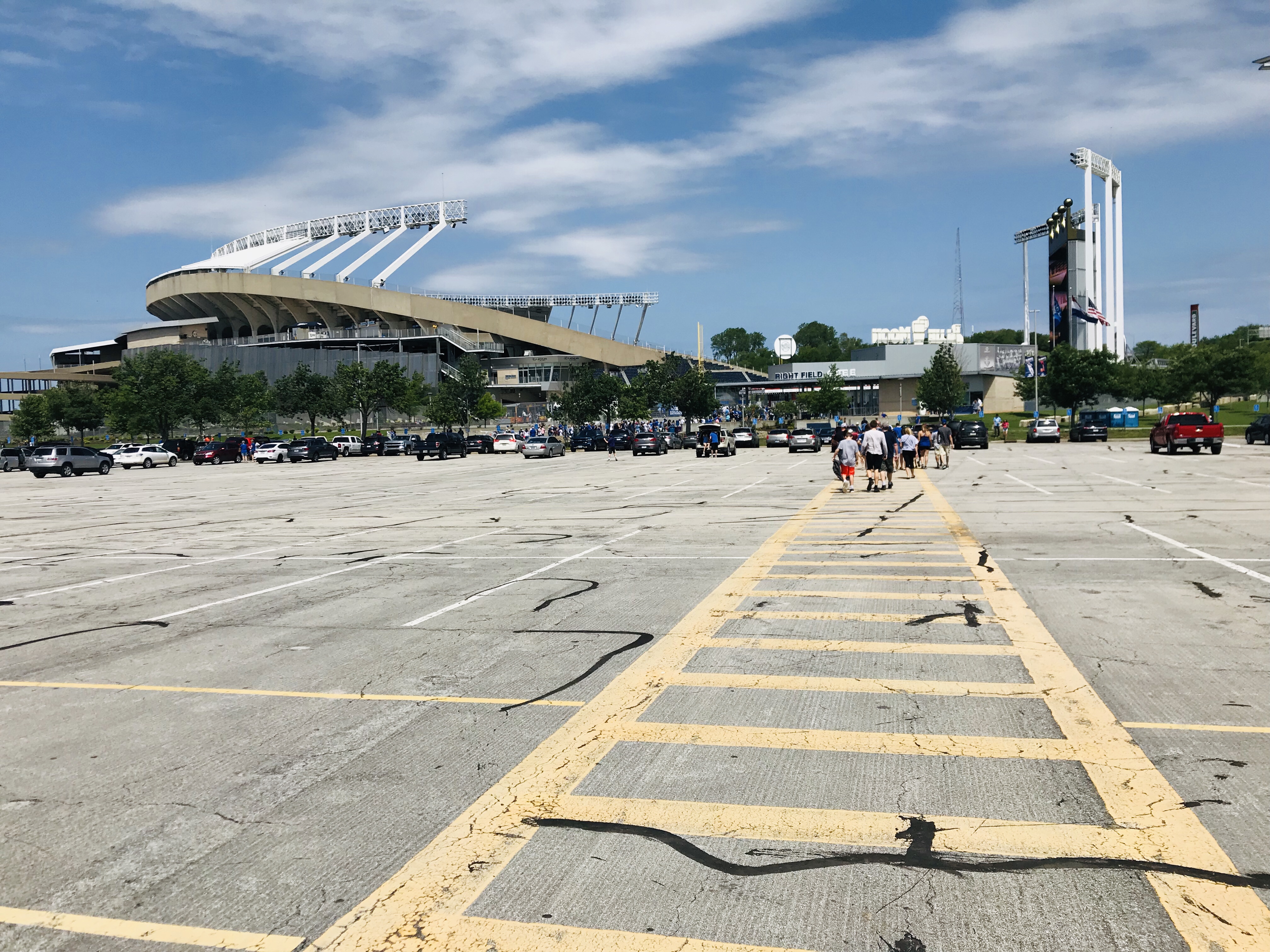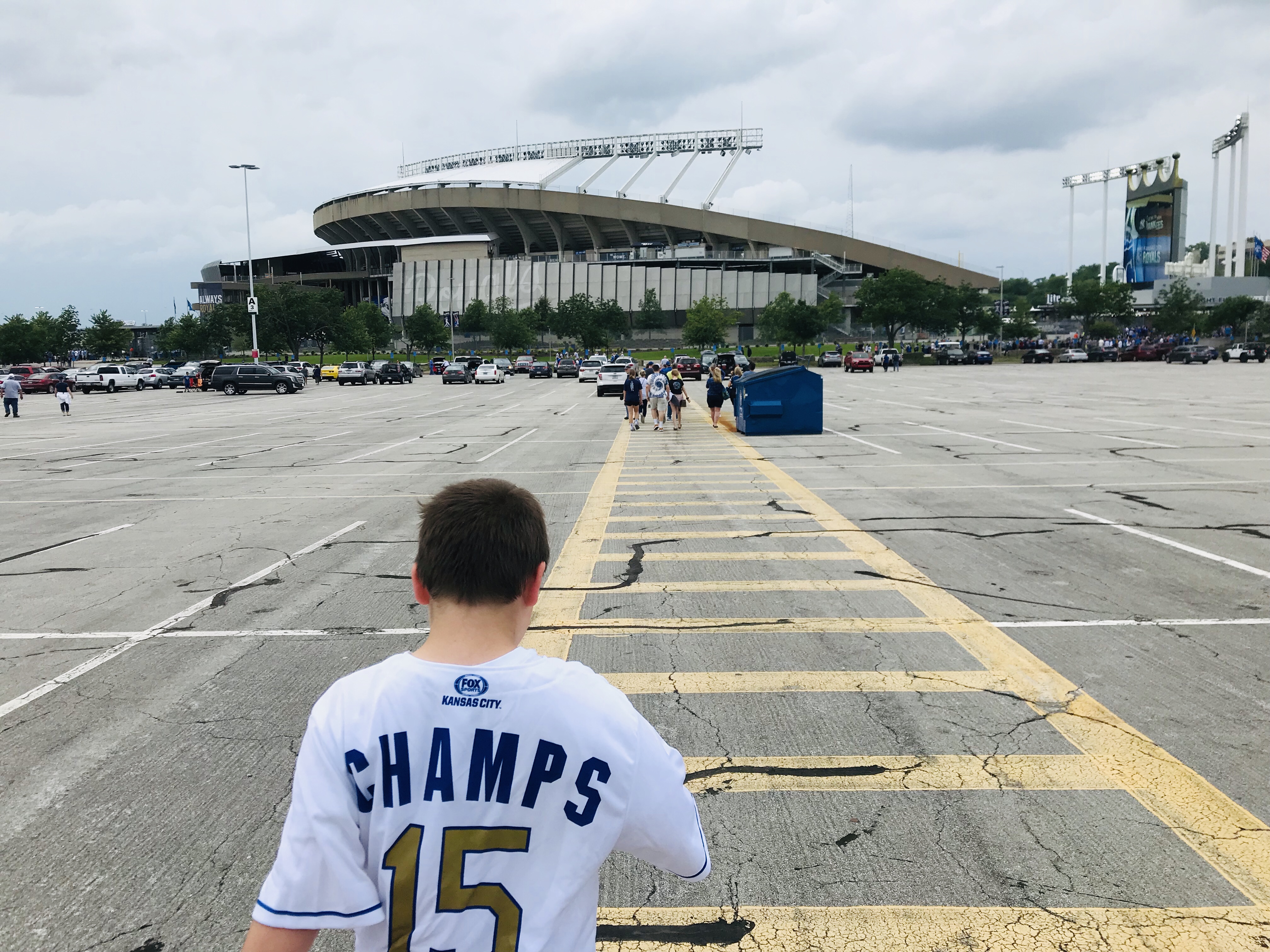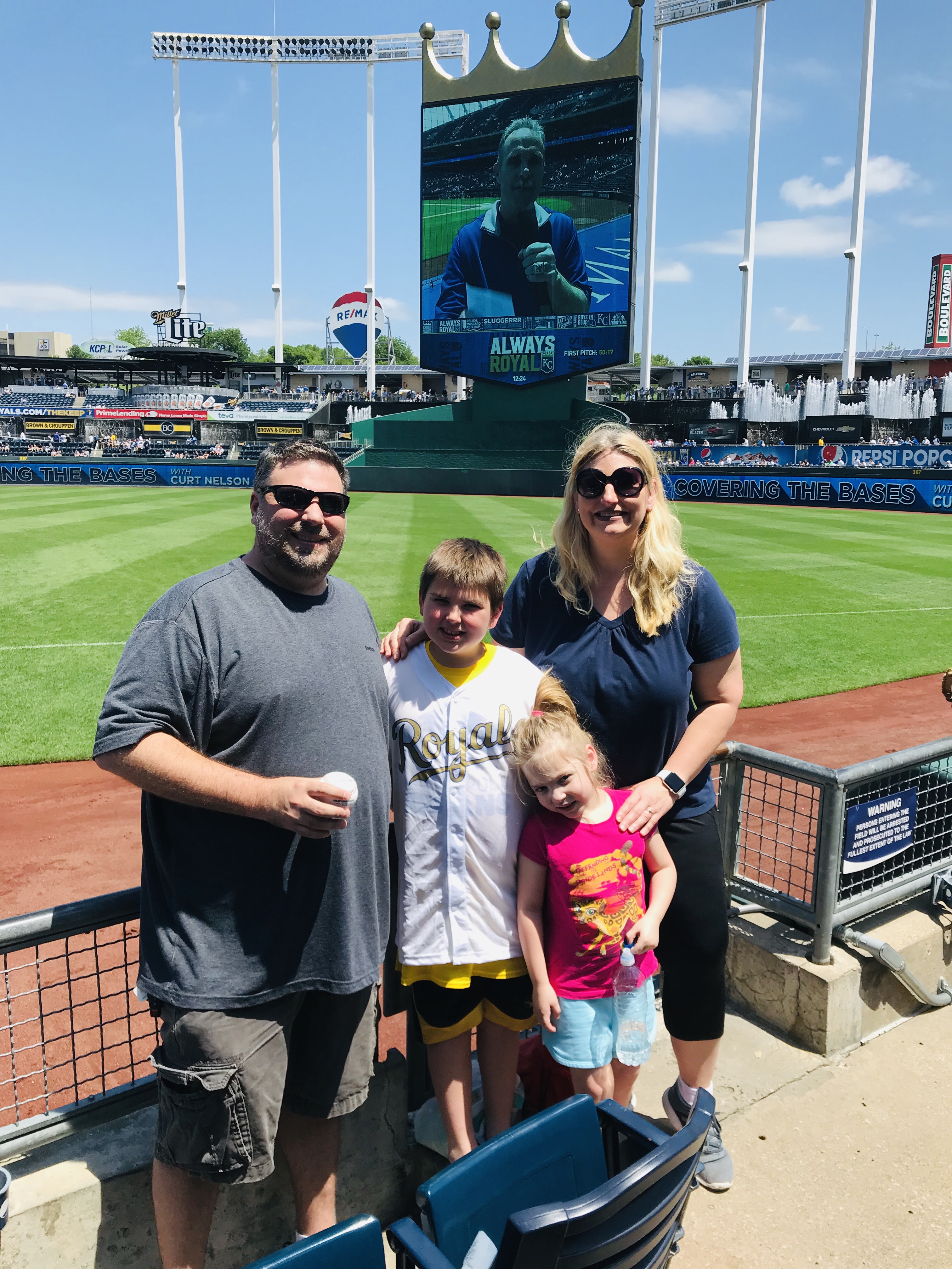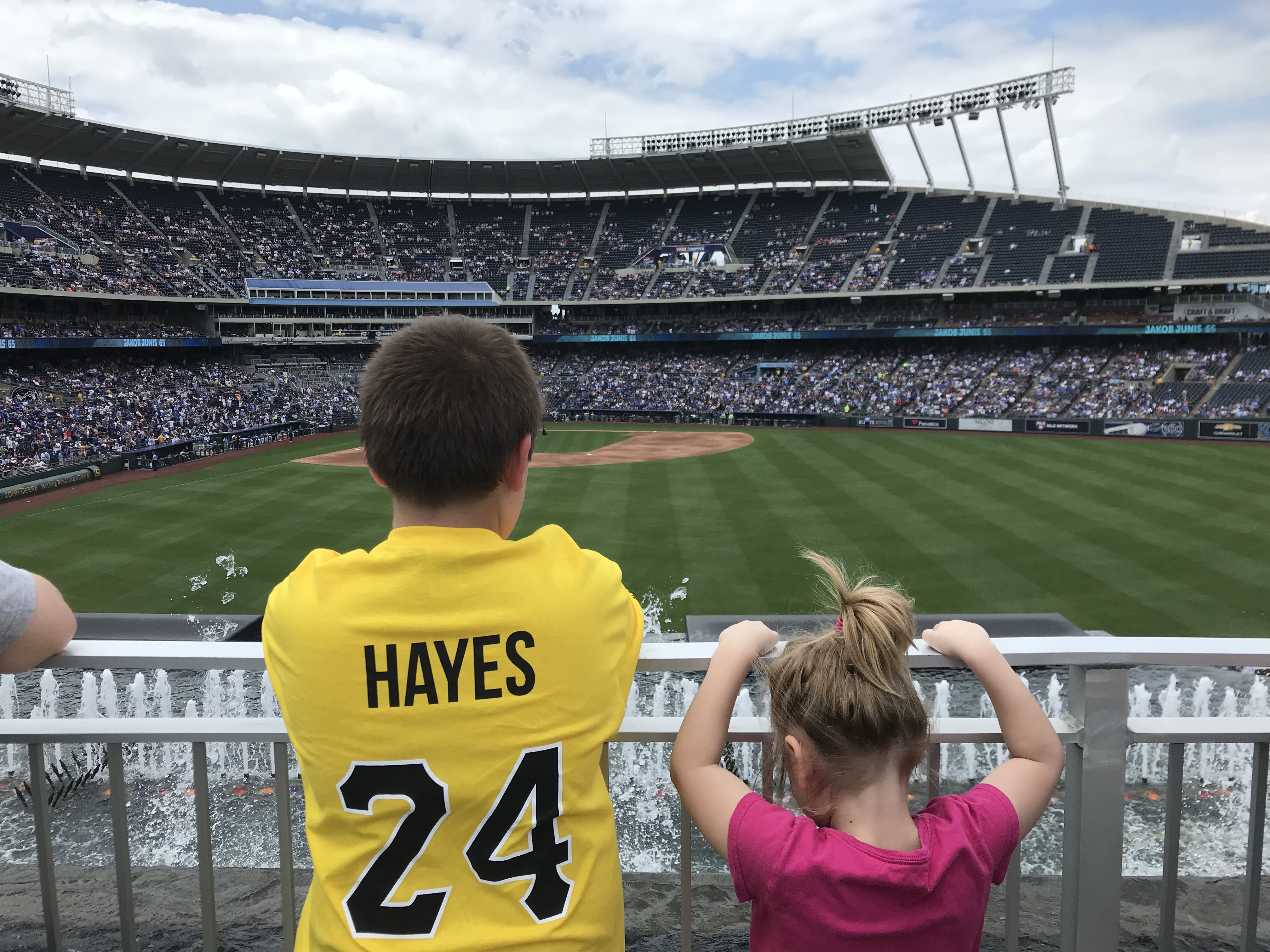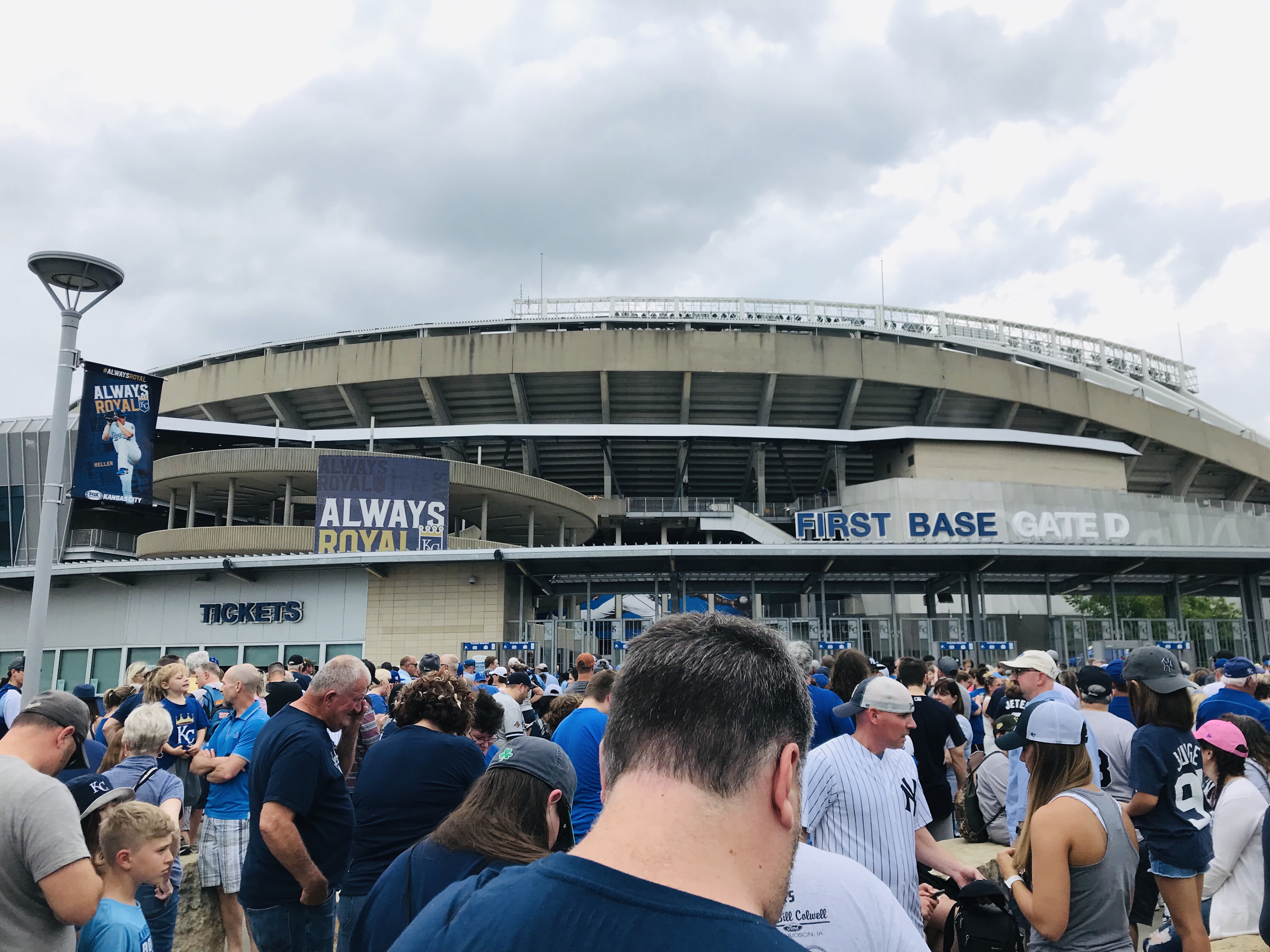 Overview: We visited Kauffman Stadium (KS) in May of 2019. It was an impromptu weekend getaway trip (it’s only 3 hours away from us). We went against our usual policy and purchased tickets from Stubhub on the day of the game (on a Friday vs. the Yankees). We were met with a severe thunderstorm with a tornado warning as we pulled up to the stadium, so we had to make a harrowing escape through the interstate mess that was KC in a downpour with no visibility. So we had to hastily sell our tickets on Stubhub and repurchase tickets for the day game of the doubleheader the next day. We were so glad it worked out because we all loved this stadium.